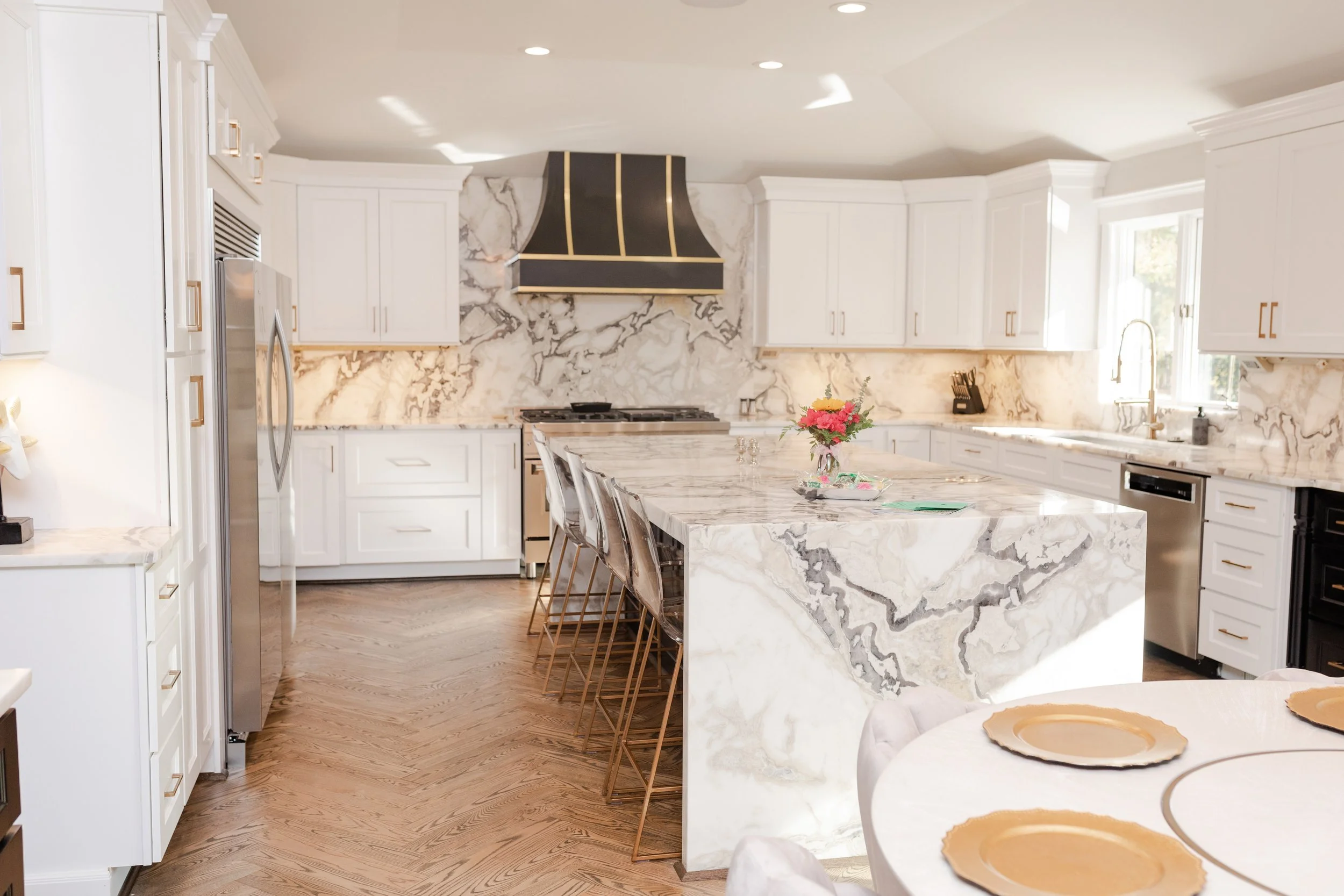 This project brought in a traditional kitchen design with a modern door style update. It features a 45” Sink, marble countertops, custom range hood and a built in base microwave.